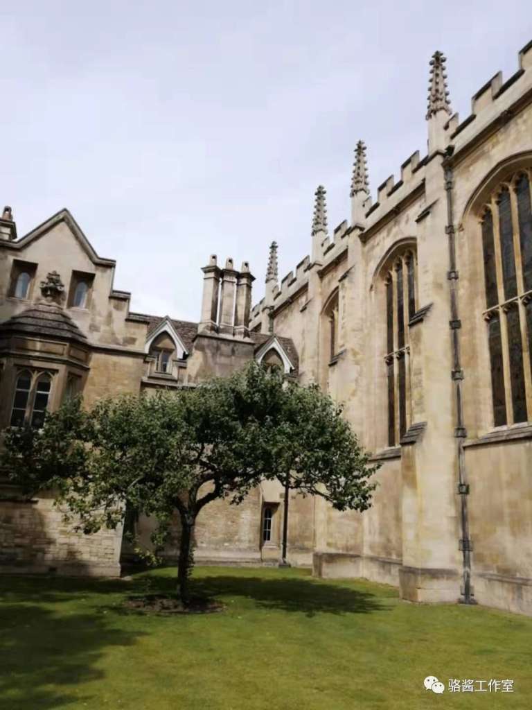 TRINITY COLLEGE门口, 它的来头可不小。 这是从前砸牛顿的那棵树。 但当时牛顿可不是在学院门口读书, 而是在自家院子里。 那颗可怜的树曾被风雨吹垮过, 而如今看到的, 是原来的树嫁接过来的。 紧接着, 我们进入了King‘s college参观。 这应该是为数不多的开放的college之一。 我们来的时候刚好遇到十二点敲钟 真是一个特别有仪式感的学校。