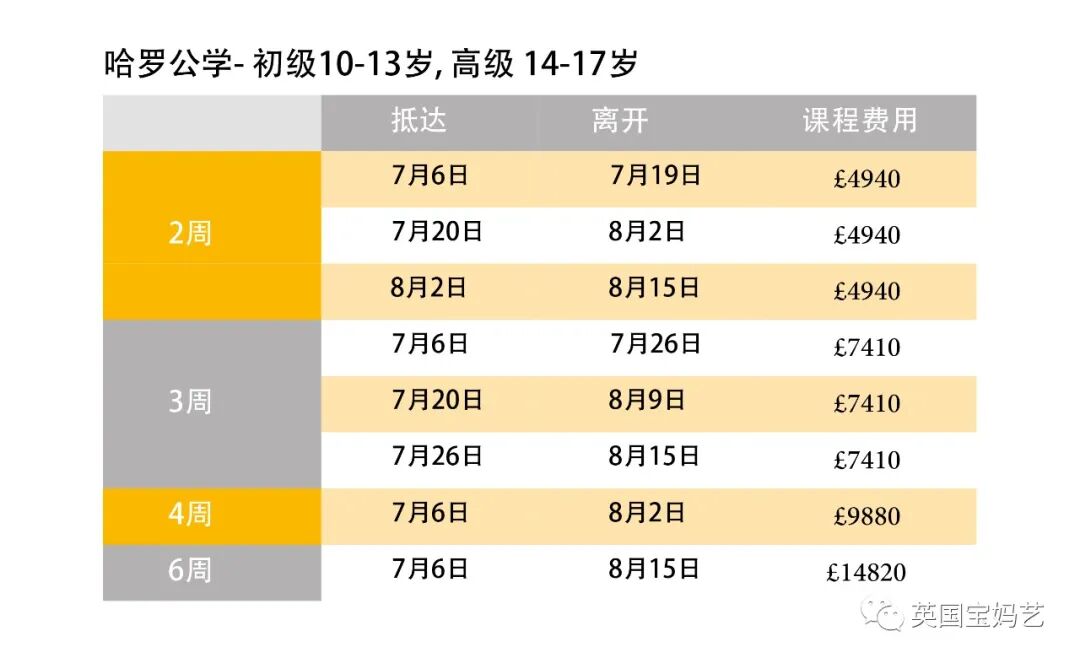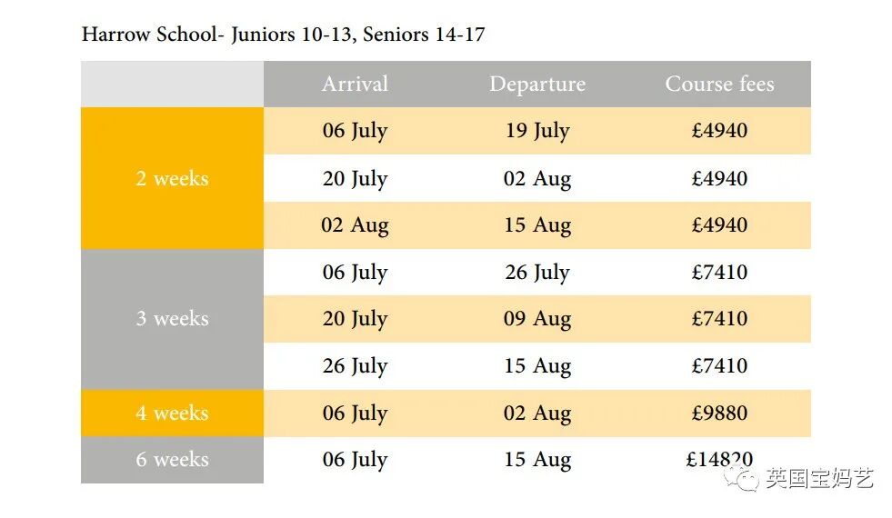 *该课程表为示例,具体行程学校可能根据天气和课程安排进行调整。 Harrow Summer School 营地价格(与官网同价)