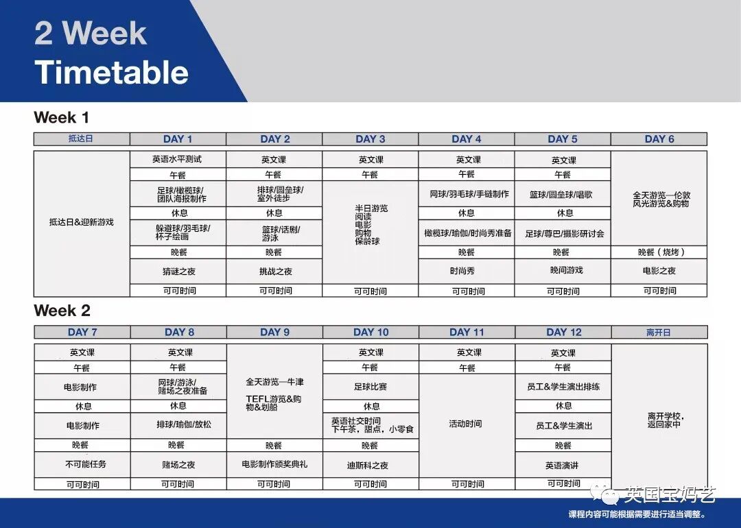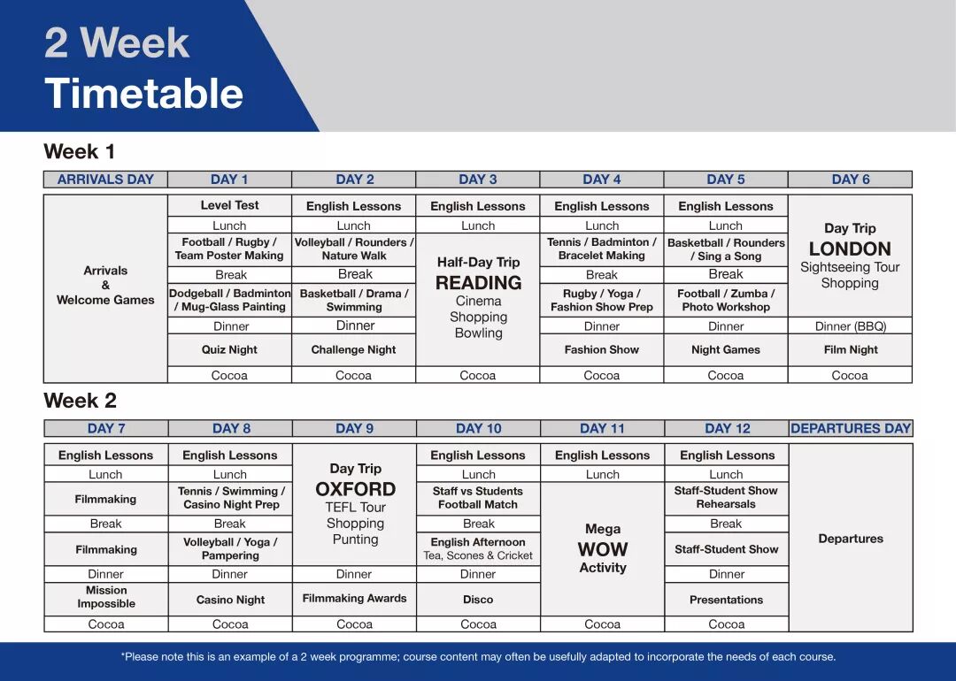 21:15 Cocoa Time 可可时间 每天晚上,在公共休息室会提供可可,学生们在睡觉前可放松休息,和朋友老师们聊天。 22:00 Bedtime 就寝时间 学生们回到自己的房间准备睡觉(就寝时间根据学生年龄有所不同) 22:30 Lights Out 熄灯 孩子们在自己的房间中休息,为另一个充满活力的夏令营的一天做好准备。 ▼具体样板课程表(点击图片可查看大图) ![]()